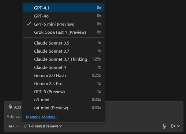 I am a VS Code IDE user. Over the last year I also started using GitHub Copilot, an AI coding assistant inside VS Code. With my university email I get Copilot Pro (normally ~$10/month) for free. This lets me use chat/agent mode with different models like Claude Sonnet 4, Gemini 2.5 Pro, and recently GPT-5.